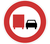 Znak zabrana preticanja za teretna vozila čija najveća dozvoljena masa prelazi 3,5 t označava put, odnosno deo puta na kome je zabranjeno da teretna vozila čija najveća dozvoljena masa prelazi 3,5 t, pretiču druga motorna vozila.