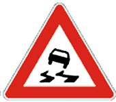 Znak klizav kolovoz označava blizinu dela puta na kome kolovoz pod određenim atmosferskim uslovima ili sličnim okolnostima ima klizavu površinu.