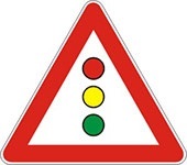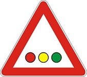Označava blizinu raskrsnice ili obeleženog pešačkog prelaza na kome je saobraćaj regulisan pomoću semafora.