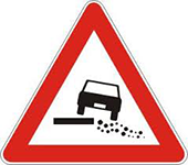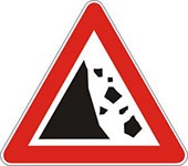 Znak odronjavanje kamenja – sa desne strane- označava blizinu dela puta na kome postoji opasnost od kamenja koje pada ili od kamenja koje se nalazi na putu.