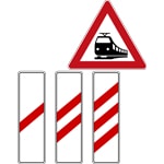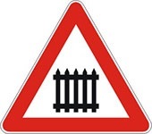 Označava nailazak na mesto ukrštanja puta sa železničkom prugom u nivou, obezbeđeno branicima ili polubranicima. Podsećamo da i na ovakvim pružnim prelazima (sa rampama) treba biti izuzetno pažljiv, pošto može lako da se desi da rampe jednostavno ne rade zbog kvara ili krađe.
