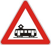 Znak ukrštanje puta i tramvajske pruge označava blizinu mesta na kome put prelazi preko tramvajske pruge u nivou.