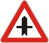 Označava blizinu raskrsnice na kojoj se put sa prvenstvom prolaza ukršta odnosno spaja sa sporednim putem.